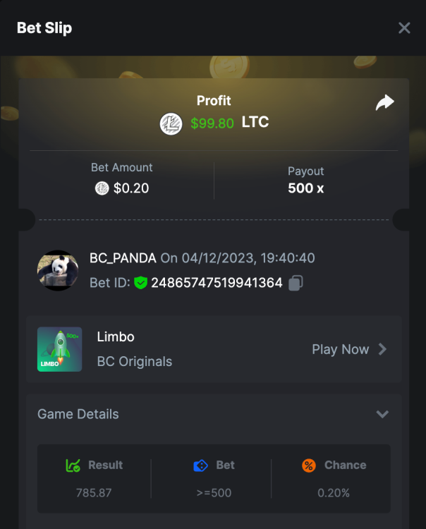 $5k Prestige Limbo Challenge #109 DURATION: 4th December - 11th December 05:30 pm UTC This weeks Prestige Challenge is back with your favourite game Limbo! Take part in this amazing yet challenging event to split prizes worth $5,000! Please check below the all new prize pool distribution table to understand more about it. We will be trying this new way for a while and depending on the participations and feedback we will further increase our pools. What's the Challenge? Win the highest multiplier you can on on BC.Game's in-house game, Limbo. If there is a tie, the player with the higher average bet amount (in USD) shall be the winner. If there is a tie in the amount and payout, the one who posted or edited his post first will be considered in the Ranking. How to Enter To enter, copy the link of the bet you'd like to submit. Once you've copied it, paste it as a reply to this thread like so: Link: https://bc.game/#/sd/11NOEOJIJDHGVJ In the same post, upload a screenshot of your win by clicking the game ID WITH VIEW IN USD mode ENABLED (accessible at the bottom of dropdown menu for your wallet up top. This way, we can ensure that your bet indeed met the minimum requirement at the time of placing it: Link: https://bc.game/#/sd/11NOEOJIJDHGVJ Minimum VIP Minimum VIP 4 with phone verified will be eligible! Minimum Payouts Minimum payout to qualify is 20x Minimum Bet Size $0.20 USD equivalent Eligible Coins All cryptocurrencies are eligible (excepting JB) Available Prizes GENERAL TERMS Please combine all of your hits together in a SINGLE post. Edit your existing post for additional hits, don't create a new post. Each eligible entry must have the Bet Slip URL, failure to include it will disqualify participation in the event. Bet Slip image is not mandatory. Bets must be posted within 24 hours of placing bet in order to keep things fair for everyone. Bets must be made during the specified time window stated above. This thread will lock automatically when the time period is over. One (1) entry per household. Anyone found attempting to win multiple prizes will be disqualified from this challenge as well as all future challenges. Failure to follow instructions will result in your submission being null and void. By entering this challenge, you acknowledge that BC.Game has the final decision on results and placement. Payouts will be distributed after the event is finished. Please note that it could take anywhere between 24 hours to 7 days after the completion of the event.