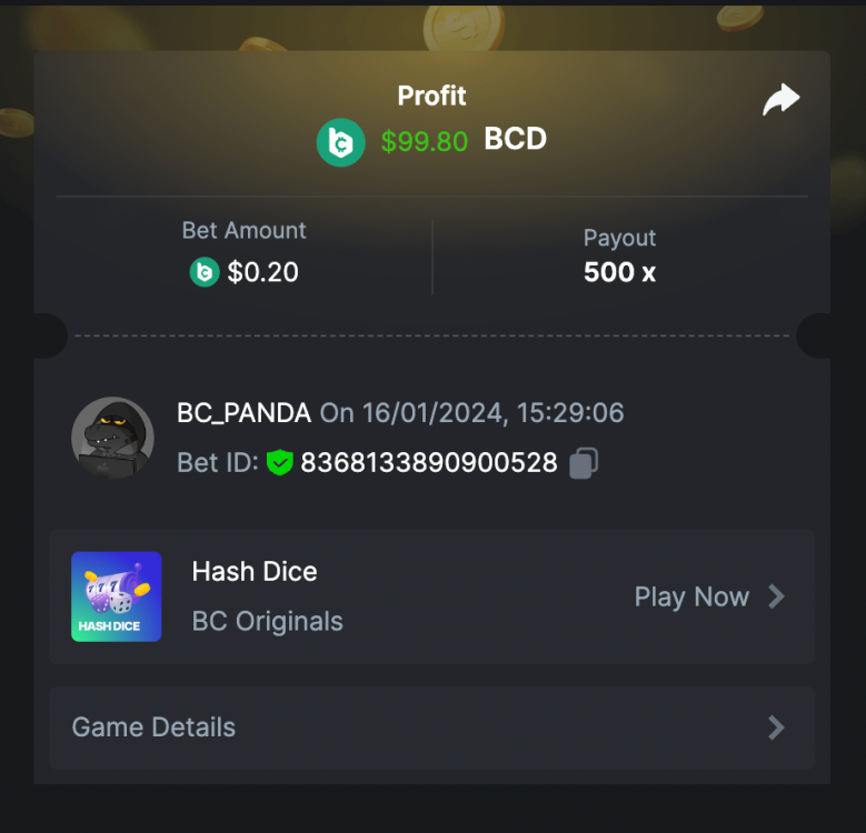 $5,000 EXCLUSIVE PRESTIGE CHALLENGE #110 DURATION: 16th JAN - 23rd JAN 02:30 pm UTC This week's Prestige Challenge is back, featuring your favorite games, Limbo and Hashdice! Dive into this thrilling event for a chance to share in a whopping $5,000 prize pool. Don't miss out on exploring our new prize distribution table below for a clearer understanding of the rewards. We're excited to try this fresh approach, and based on participation and feedback, we're considering boosting our prize pools even further. Join us in Limbo and Hashdice for an exhilarating challenge and your chance to win big! What's the Challenge? Win the highest multiplier you can on both games: Limbo & Hashdice If there is a tie, the player with the higher average bet amount (in USD) shall be the winner. If there is a tie in the amount and payout, the one who posted or edited his post first will be considered in the ranking. How to Enter To enter, copy the link of the bet you'd like to submit. Once you've copied it, paste it as a reply to this thread, like so: Link: https://bc.game/#/sd/11QMOVKEKZXUBB | https://bc.game/#/sd/11QMOXXW2WDPJV In the same post, upload a screenshot of your win by clicking the game ID WITH VIEW IN USD mode ENABLED (accessible at the bottom of dropdown menu for your wallet up top. This way, we can ensure that your bet indeed met the minimum requirement at the time of placing it: Minimum VIP A minimum of Level 4 with the phone verified will be eligible! Minimum Payouts Minimum payout to qualify is 50x Minimum Bet Size $0.20 USD equivalent Eligible Coins All cryptocurrencies are eligible (excepting JB) Available Prizes GENERAL TERMS Please combine all of your hits into a single post. Edit your existing post for additional hits; don't create a new post. Each eligible entry must have the Bet Slip URL; failure to include it will disqualify participation in the event. The Bet Slip image is not mandatory. Bets must be posted within 24 hours of placing the bet in order to keep things fair for everyone. Bets must be made during the specified time window stated above. This thread will lock automatically when the time period is over. One (1) entry per household. Anyone found attempting to win multiple prizes will be disqualified from this challenge as well as all future challenges. Failure to follow the instructions will result in your submission being null and void. By entering this challenge, you acknowledge that BC.Game has the final say on results and placement. Payouts will be distributed after the event is finished. Please note that it could take anywhere between 3 to 7 days after the completion of the event.
