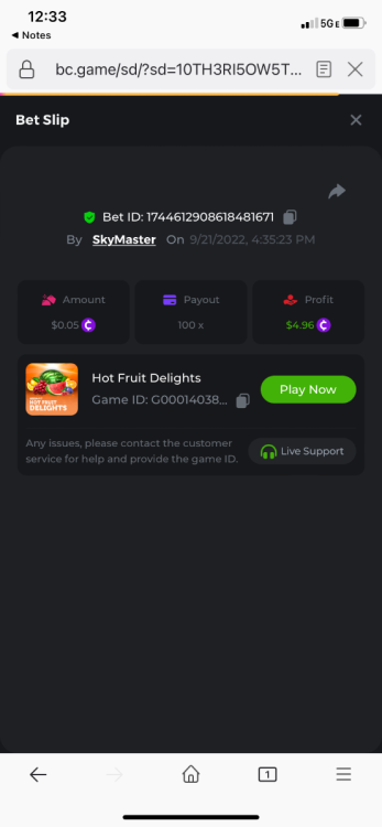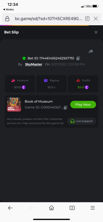 bassabar Posted September 21, 2022 Share Posted September 21, 2022 Total multiplier: 90x Bounty (50x): No https://bc.game/sd/?sd=10TH1M87314M4Z Link to comment Share on other sites More sharing options...