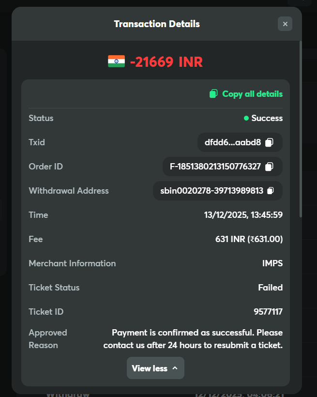Hjyyuczzarac Posted December 14 Share Posted December 14 (edited) Hello BC.Game Team, I made a withdrawal of ₹21,669 which shows as SUCCESSFUL on BC.Game. Details: Amount: ₹21,669 Date: 13-Dec-2025 Bank: State Bank of India (SBI) I contacted my bank (SBI) and they confirmed that the amount has NOT been received. They asked me to request a bank-level trace or reversal from the sender. Kindly escalate this issue to the finance/payment gateway team and let me know: 1) Current status of the transaction 2) Whether it is pending or will be reversed 3) Expected timeline for resolution Thank you. Edited December 14 by Hjyyuczzarac Link to comment Share on other sites More sharing options...